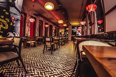 Sushi-Restaurant€Im Gastraum mit roten Wänden werden Klassiker der chinesischen Küche und Sushi auf dem Laufband serviert.